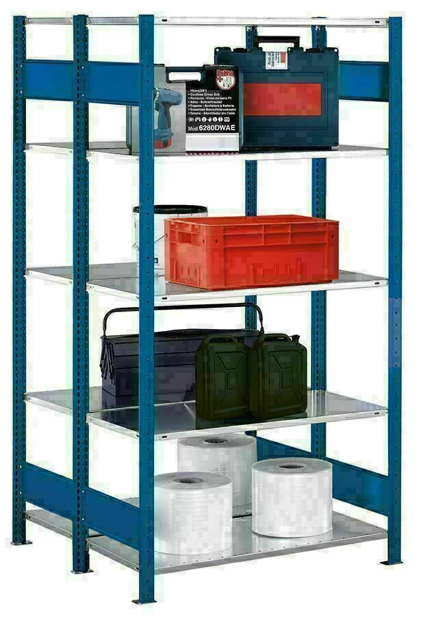 Doppelregal Stecksystem, Grundregal, mit Kreuzstrebe, H3000xB1000xT2x600, Fachlast 250kg, RAL 5010 enzianblau / verzinkt
