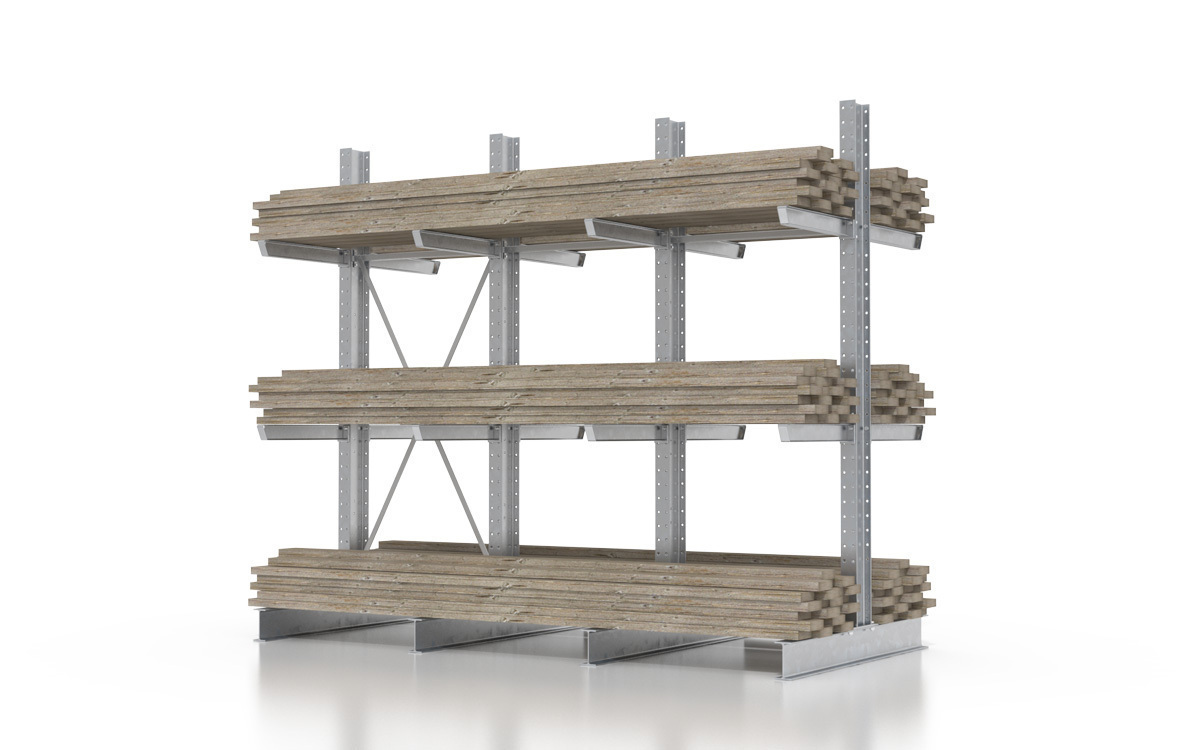 Kragarmregal für Holzlagerung, beidseitig nutzbar, H4500xB3850xT1000 mm, 3 Lagerebenen, Armlast 500 kg, feuerverzinkt