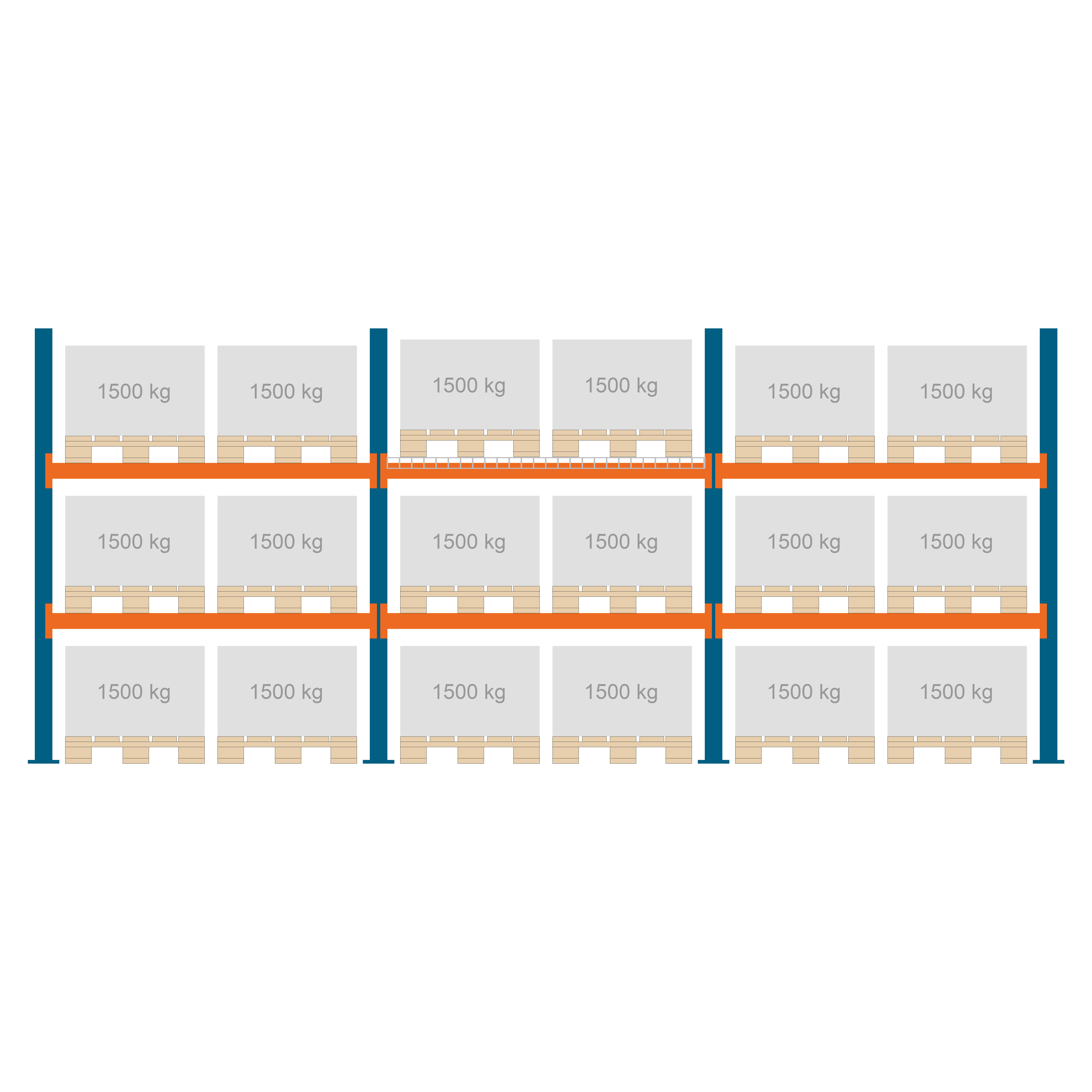 - Feld 2: H2500xB1825xT1100 mm, Lagerebenen 3, Fachlast 3.000 kg, Feldlast 6.900 kg, max. Palettengewicht 1.500 kg, 1 Drahtgitterboden